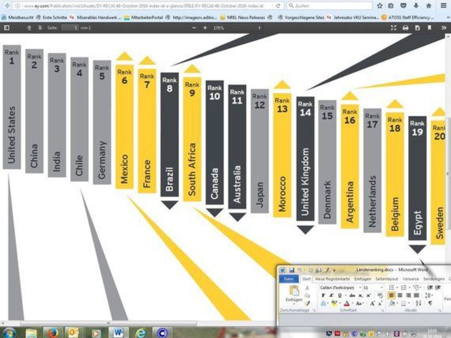 Der neue Renewable Energy Country Attractiveness Index (RECAI) bestätigt nur wenige länger anhaltende klare Entwicklungen. Dazu gehört das für Investitionen in Erneuerbare-Energien-Anlagen zunehmend bessere Klima in den zwei süd- und mittelamerikanischen Ländern Chile und Mexiko. So hatte Chile schon im Mai einen über ein Jahr währenden kontinuierlichen Aufstieg von Rang Elf – Indexwert vom März 2015 – auf Rang Vier hinter sich. Nun bestätigte das Andenland diese Stabilität erneut: Zum zweiten Mal steht es nun als Vierter einen Platz vor dem führenden Land Europas, vor Deutschland, und nur noch hinter den auf dem Spitzenplatz notierten USA, hinter China, hinter Indien. Mexiko rückte laut der Wirtschaftsprüfungsgesellschaft Ernst amp; Young (EY), die den RECAI führt, im selben Zeitraum sogar von 22 auf 6 direkt nach Deutschland vor. Für beide Länder spricht offenbar ein gut funktionierender marktwirtschaftlicher Wettbewerb: In den jeweils jüngsten nationalen Ausschreibungsrunden akzeptierten die Investoren oder Projektplaner niedrigste langjährige Einspeisepreise für den aus Wind- oder Solarparks in die Netze gelieferten Strom als ausreichend für ihr angelegtes Geld.