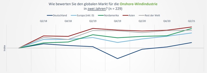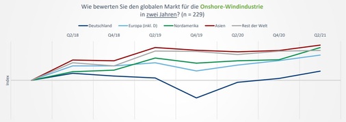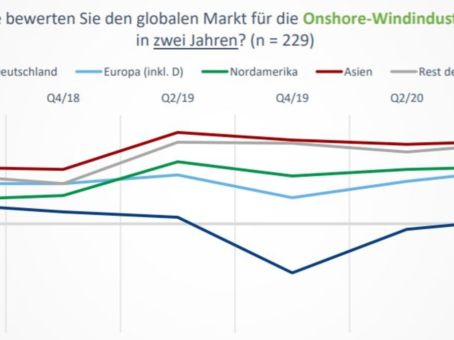 Die Stimmungskurven für die ausländischen Märkte Europa, Amerika, Asien sowie der Windkraftausbau im Rest der Welt nahmen gemäß dem Windresearch-Index in ganz ähnlicher Kurvenbewegung zu. Der von dem Bremer Erhebungsdienst Trendindex beziehungsweise „WEtex“ genannte Index ergibt allerdings nach wie vor für alle diese drei ausländischen Markt-Großregionen deutlich bessere Erwartungswerte. Und der asiatische Markt an erster sowie der US-amerikanische Markt an knapp zweiter Stelle erzielen hierbei jeweils die Bestwerte. Erstmals seit 2018 kommt dabei der US-Markt in der Bewertung annähernd so gut weg wie der Asien-Markt.