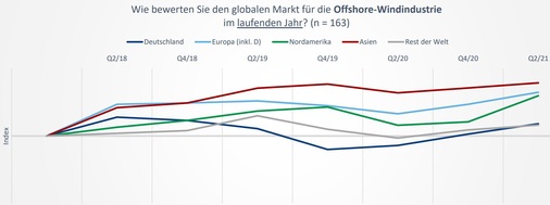 Allerdings: Für das zweite Quartal des Jahres 2023 erwarten die Befragten aus der Branche eine immer noch deutlich bessere Lage der Offshore-Windkraftmärkte des übrigen Europas, der USA und Asiens, als sie diese für die deutschen Gewässer erwarten. Dabei sehen sie alle dieser drei ausländischen Großregionen auf dem gleichen positiven Niveau.