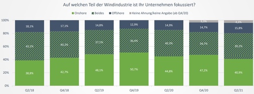 40,9 Prozent der 501 Teilnehmer der Erhebung kommen von Unternehmen, die sich auf Windenergie an Land konzentrieren, während 39,2 Prozent von gleichzeitig onshore wie offshore tätigen Unternehmen kamen. 15,8 Prozent der Teilnehmer arbeiten in ausschließlich in der Offshore-Windkraft tätigen Unternehmen. 40,7 Prozent der Befragten wiederum sind im Planungs- und Projektierungsgeschäft tätig, während 37,3 Prozent in der Herstellung der Anlagen oder ihrer Komponenten arbeiten. 13 Prozent gaben an, Finanzierung und Versicherung von Projekten und Anlagenparks zu betreiben.