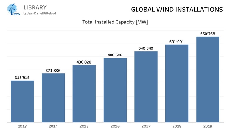 Ende 2019 war weltweit eine Windkraftleistung von 650,8 Gigawatt (GW) installiert. Das gab die World Wind Energy Association (WWEA) jetzt bekannt. 59.667 Megawatt (MW) wurden 2019 neu ans Netz gebracht. 2018 waren es mit 50.252 MW deutlich weniger. Laut WWEA war das vergangene Jahr damit das drittstärkste Windinstallationsjahr nach 2016 und 2017 mit einer Wachstumsrate von 10,1 Prozent. Alle Windturbinen zusammen können nun mehr als sechs Prozent des weltweiten Strombedarfs decken.