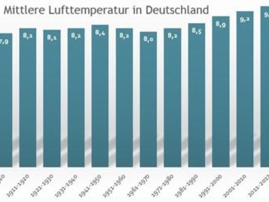 - Selbst beim Vergleich gegenüber den drei Jahrzehnten 1881-1910 beträgt die Temperaturzunahme in Deutschland bereits 1,7 Grad Celsius (2011 bis 2017) bzw. 1,8 Grad Celsius (2011 bis erste Jahreshälfte 2018).