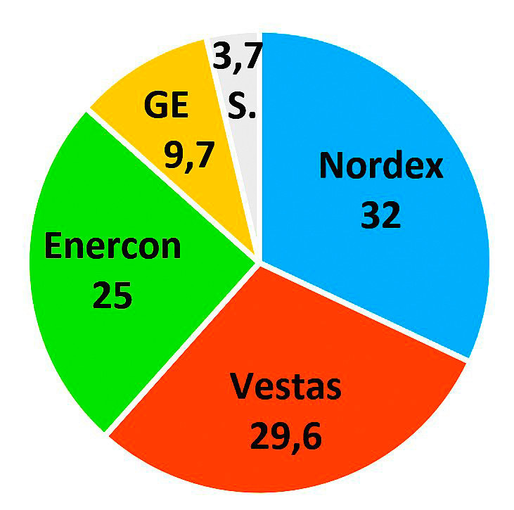 Keine erwähnenswerte Rolle spielten 2022 Vensys, Eno Energy aus Rostock sowie Max Wyn, die Windturbinen-Tochter des Betonturmzulieferers Max Bögl. Letztere errichtet letzte Anlagen der nicht mehr existierenden Senvion. Vensys und Eno Energy steht aber die Einführung der Sechs-MW-Klasse in den kommenden zwei Jahren bevor.