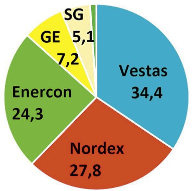 Deutschlands Fünftplatzierter bewahrte mit 17 Errichtungen der 6,6-MW-Anlage SG 6.6-155 und 15 im Leistungsbereich 4,1 bis 5,0 MW einen 5,1-Prozent-Marktanteil. Um Kosten zu senken, muss Siemens Gamesa das Anlagenportfolio ausdünnen. „Die 5.X mit ihren Modellvarianten mit 155 Meter beziehungsweise 170 Meter Rotordurchmesser werden Hauptanlagen für den deutschen Markt bleiben“, sagt ein Firmensprecher. Zugleich gab es Genehmigungen für 39 SG 6.6-170 und 51 Anlagen verschiedener Modelle der Vier- bis Fünf-MW-Klasse.