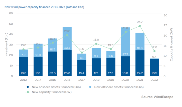 Die europaweiten Investitionen in Windenergie sind 2022 massiv zurückgegangen. Wie der europäische Verband Wind Europe in seinem Finanz- und Investmentbericht schreibt, wurden lediglich 17 Milliarden Euro in neue Windparks investiert, der niedrigste Stand seit 2009. 2021 waren es noch 41 Milliarden Euro.
