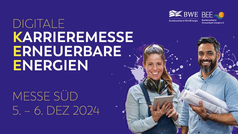 Berufe des Erneuerbare-Energien-Geschäfts und Tipps zum Einstieg in seine Tätigkeitsfelder stehen im Fokus der nächsten digitalen Karrieremesse Erneuerbare Energien (KEE) „Messe Süd“ am 5. und 6. Dezember. Seien Sie auch als Aussteller dabei.