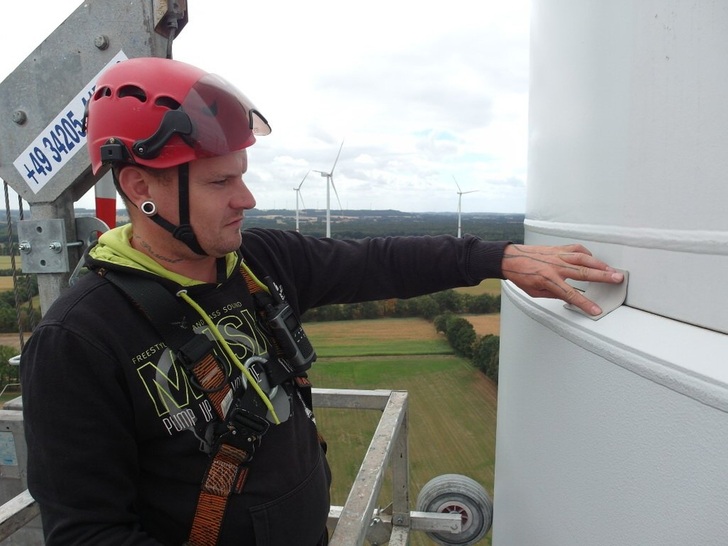 Neben dem Maschinenhaus verdient auch der Turm einen genauen Blick des Service-Monteurs. Auch an Hybridtürmen der neueren Baureihen können Risse und Abplatzungen am Beton auftreten. Insbesondere die hochdynamisch beanspruchten Adapterelemente im Übergangsbereich vom Beton- auf den Stahlturm sind dabei im Fokus. "Risse, die dabei teilweise durch die gesamte Konstruktion gehen, müssen vor eindringendem Wasser geschützt werden", sagt Klaus Deininger von der KTW Umweltschutztechnik GmbH. Hochelastische, langzeitgetestete Abdichtungssysteme finden damit laut Deininger auch in großen Höhen ihren Einsatz. Bei Abplatzungen oder notwendigen Tragwerksverstärkungen können Sheets auf CFK-Basis (carbonfaserverstärkte Kunststoffe) verwendet werden. "Durch den Einsatz von herkömmlicher Bühnentechnik ist das kostengünstig", so der KTW-Mann.