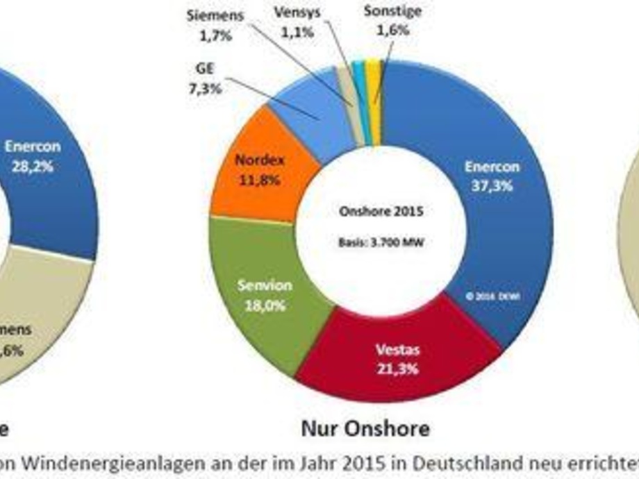 Verlierer an Land ist auch Siemens. Statt 2,3 Prozent waren es 2015 noch 1,7 Prozent. Das ist ein durchaus messbarer Rückgang. Denn das Ausbaujahr 2015 brachte noch 3,7 Gigawatt (GW) neue Onshore-Windkraft in Deutschland ans Netz, im Vorjahr waren es aber 4,7 beziehungsweise ein GW mehr.