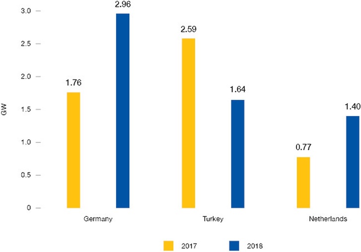 Als führender Markt in Europa hat sich Deutschland im vergangenen Jahr etabliert. Mit einem Zubau von fast drei Gigawatt hatten die Installateure und Planer hierzulande wieder mehr zu tun. Der im vergangenen Jahr zweitgrößte Markt war die Türkei. Dort wurden 2018 immerhin 1,64 Gigawatt Solarstromleistung neu installiert – ein Marktwachstum von 37 Prozent. Als neuer Gigawattmarkt haben sich die Niederlande im letzten Jahr etabliert. In dem kleinen Land wurden 2018 immerhin 1,4 Gigawatt neu installiert. Damit hat sich der Markt nahezu verdoppelt, nachdem 2017 nur 770 Megawatt Photovoltaikleistung neu ans Netz gingen.