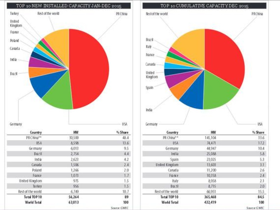 China hat mit 145 GW die EU mit 141,6 GW Gesamtleistung überflügelt. Die Volksrepublik treibe den Ausbau der Windkraft massiv voran, um ihre Abhängigkeit von der Kohle zu reduzierten, die für massiven Smog in Chinas Städten sorgt. Gleichzeitig hat Indien die Spanier überflügelt und sich als neuer viertgrößter Markt etabliert - mit 2,6 GW installierter Leistung im Jahr 2015. Platz 1, 2 und 3 gehören nach wie vor China, USA und Deutschland.