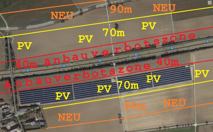 Erläuterung der Grafik: Bisher wird regelmäßig ein Abstand von 40 m zu Autobahnen eingehalten, der nicht bebaut wird, die sogenannte Anbauverbotszone. Dann folgt eine 70 m breite Zone, hier in gelb mit „PV“ gekennzeichnet, dort existiert schon derzeit ein EEG-Vergütungsanspruch. Neu wäre der EEG-Vergütungsanspruch im orange markierte Bereich, die Erweiterung um 110 m auf dann insgesamt 200 m bis zur Autobahn.