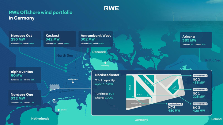 Wie der dänische Windturbinenhersteller nun mitteilte, bestellte der Energieversorger 60 der größten Vestas-Meereswindturbinen V-236 mit 15 Megawatt (MW) Nennleistung für das 900-MW-Projekt Nordseecluster B. Die Errichtungen in dem 2023 für neue Offshore-Windparkprojekte ausgeschriebenen Areal sollen 2028 beginnen. 2029 soll Nordseecluster B dann vollständig den Betrieb aufnehmen. Schon im Juni hatte RWE die 44 Anlagen vom Typ V-236 für Nordseecluster A in die Vestas-Auftragsbücher eintragen lassen. Die Ausschreibung mit dem Zuschlag für RWE dieses ersten Bauabschnitts mit 660 MW hatte 2021 stattgefunden. Der Netzanschluss von Nordseecluster A soll bis 2027 erfolgen.