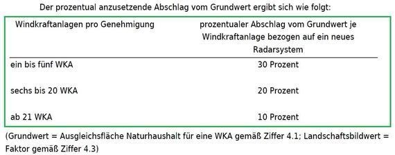 Bei fünf Windenergieanlagen darf mehr vom Grundwert abgezogen werden (5 x 30 Prozent = 150 Prozent) als bei sechs Windenergieanlagen (6 x 20 Prozent = 120 Prozent). Baut jemand einen Windpark mit sechs Windenergieanlagen, dann bekommt er einen geringeren Nachlass auf den Grundwert als jemand mit einem Windpark mit fünf Windenergieanlagen, auch in der Gesamtsumme. Das Gleiche gilt, wenn jemand insgesamt sieben Anlagen auf Bedarfssteuerung umstellt, auch dieser bekommt mit 140 Prozent weniger als der kleinere Windpark mit fünf Anlagen (150 Prozent).