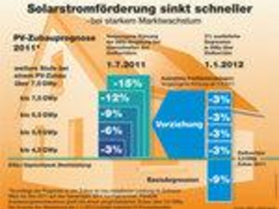 Wie der Bundesverband Solarwirtschaft (BSW-Solar) heute mitteilt, besteht Einigung über die Absenkung der Einspeisetarife für dieses Jahr. Zusammen mit dem Bundesumweltministerium (BMU) ist die Solarbranche überein gekommen, dass die Degression zum Teil auf den 1. Juli vorgezogen wird. Dabei handelt es sich nicht nur um die reguläre Senkung der Förderung. Auch eine Sonderdegression, wie sie bisher von der Solarbranche abgelehnt wurde, ist möglich. Diese hängt von der erwarteten Marktentwicklung dieses Jahr ab und kann drei bis 15 Prozent betragen. Die Höhe richtet sich nach den Vorgaben im Erneuerbare Energiengesetz (EEG). Berechungsgrundlage dafür ist die Entwicklung der Binnennachfrage für Photovoltaik in den Monaten März bis Mai. Sollte die Hochrechnung ergeben, dass am Ende des Jahres ein Zubau von weniger als 3,5 Gigawatt zu erwarten ist, wird die Höhe der Einspeisetarife wie vorgesehen erst zum Jahresanfang 2012 angepasst. Auch wird es dann zu keiner Sonderdegression kommen.