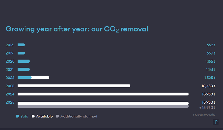 Die Basis für die Skalierung bilden neue hochmoderne Pyrolyseanlagen der Firma Pyreg Typ PX1500, von denen Novocarbo zwei im 3. Quartal 2022 in Mecklenburg-Vorpommern in Betrieb nimmt und damit jährlich rund 2.700 zusätzliche Tonnen an Carbon Removal Credits produziert. Bereits im Sommer 2022 nimmt eine weitere Anlage bei einem namhaften deutschen Industriekonzern den Betrieb auf, die rund 1.350 Carbon Removal Credits jährlich generiert. 2023 und 2024 folgen zwei weitere Carbon Removal Parks mit einer zusätzlichen Entnahmeleistung von 10.800 t CO2 p.a. Darüber hinaus sind weitere Standorte in der Entstehung: bis 2025 wird die Kapazität nach aktueller Planung auf über 30.000 t CO2 pro Jahr erweitert.
