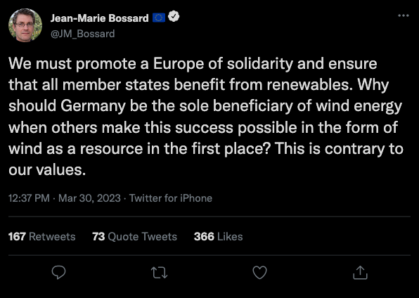 Wesentlich konfrontativer und weit weniger kompromissbereit klang dagegen die Aussage der französischen Klima- und Wirtschaftsministerin Geneviève Moreau in ihrem Tweet am selben Tag. Darin heißt es: „Wir werden nicht darüber diskutieren. Es ist, wie es ist: Französischer Wind weht den Deutschen Geld in die Tasche. Wo ist unser Lohn? Wir wollen und wir werden diese Ungerechtigkeit beenden, das sind wir unseren Wählerinnen und Wählern schuldig.“