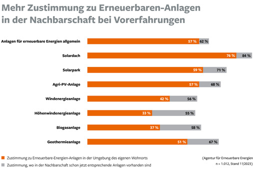 Wie verhält es sich jedoch, wenn Erneuerbare-Energien-Anlagen in der Umgebung des eigenen Wohnorts gebaut werden? Dabei unterscheidet die Umfrage danach, ob die Befragten einen Bau allgemein befürworten würden, und wie Befragte dazu stehen, die bereits eine entsprechende Anlage in ihrer Umgebung besitzen. Es zeigt sich bei jeder Energietechnik: Sind bereits Anlagen in der Nachbarschaft, so ist jeweils die Zustimmung auch höher. Allgemein unterstützen rund 60 Prozent den Bau einer Erneuerbaren-Anlage in ihrer näheren Umgebung. Besonders viel Zustimmung erhalten Solaranlagen. Solardächer würden 76 Prozent befürworten, und sogar 84 Prozent mit entsprechenden Anlagen in der eigenen Nachbarschaft unterstützen die Technologie. Die Windenergie trifft dagegen auf nicht so viel Zuspruch. Lediglich 42 Prozent sind allgemein für Anlagen in der Nähe. Der Wert steigert sich auf 56 Prozent bei Befragten, die bereits damit Erfahrung gesammelt haben.