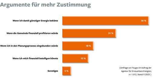 Nach der Umfrage kann die Zustimmung jedoch noch gesteigert werden, wenn der Bau der Nachbarschaftauch zugutekommt. 50 Prozent der Befragten würden den Bau einer Erneuerbaren-Energie-Anlage befürworten, wenn sie dadurch günstigere Energie erhalten würden. Ebenso würden 31 Prozent gutheißen, wenn dadurch die Gemeinde finanziell profitieren würde. Weitere Gründe für mehr Zustimmung zielen auf die finanzielle oder planerische Beteiligung bei Bau und Betrieb ab. Fabian Kauschke