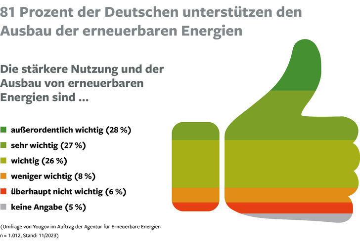 81 Prozent der deutschen Bevölkerung unterstützen nach einer Umfrage von Yougov im Auftrag der Agentur für Erneuerbare Energien (AEE) den Ausbau der erneuerbaren Energien. Somit finden vier von fünf Befragten die verstärkte Nutzung regenerativer Energien außerordentlich wichtig, sehr wichtig oder wichtig. Dass dem Thema keine Wichtigkeit zukomme, sagten nur sechs Prozent.