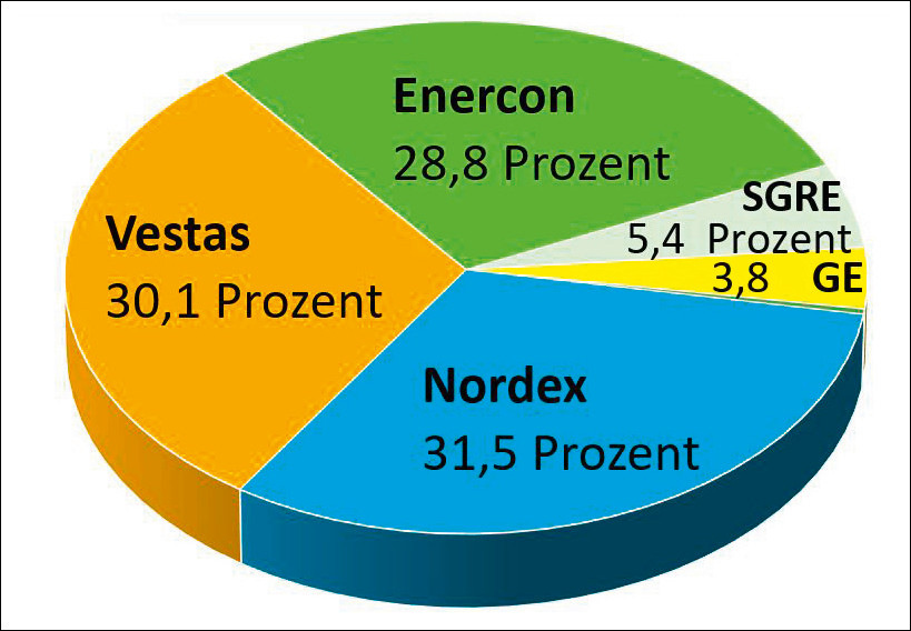 Weil sich die Technologie weiter angleicht und Modelle- und Anlagenwechseln leichter wird, dürfte die fast gleichmäßige Aufteilung des Marktes auf drei Turbinenbauer kein Zufall sein. Nordex erneut vor Vestas und Enercon erzielten gemessen an der neuen Erzeugungskapazität 31,5 und 30,1 sowie 28,8 Prozent am Errichtungsgeschäft (siehe Tortengrafik nächste Seite). Dabei dominierten die in mehreren Leistungsvarianten errichteten Flaggschiffmodelle (siehe Tabelle linke Seite). Dass Nordex die N149 (4,5 bis 5,7 MW) an vierter Position mit 663,9 MW noch ähnlich stark zubaute, dürfte den Hamburgern die Marktführung gesichert haben.