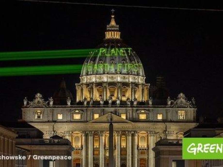 Aus 800 Metern Entfernung strahlten von Greenpeace aufgebaute Laser in aller Frühe und noch bei Dunkelheit den Schriftzug Planet Earth First auf die Kuppel des Petersdoms. Mit der Botschaft – wörtlich: Planet Erde zuerst – hätten die Greenpeace-Aktivisten für mehr statt weniger Klimaschutz demonstriert, ließ die Organisation anschließend wissen. Der Slogan sei Antwort auf Trumps Slogan der Präsidentenwahlkampagne 2016, America First.
