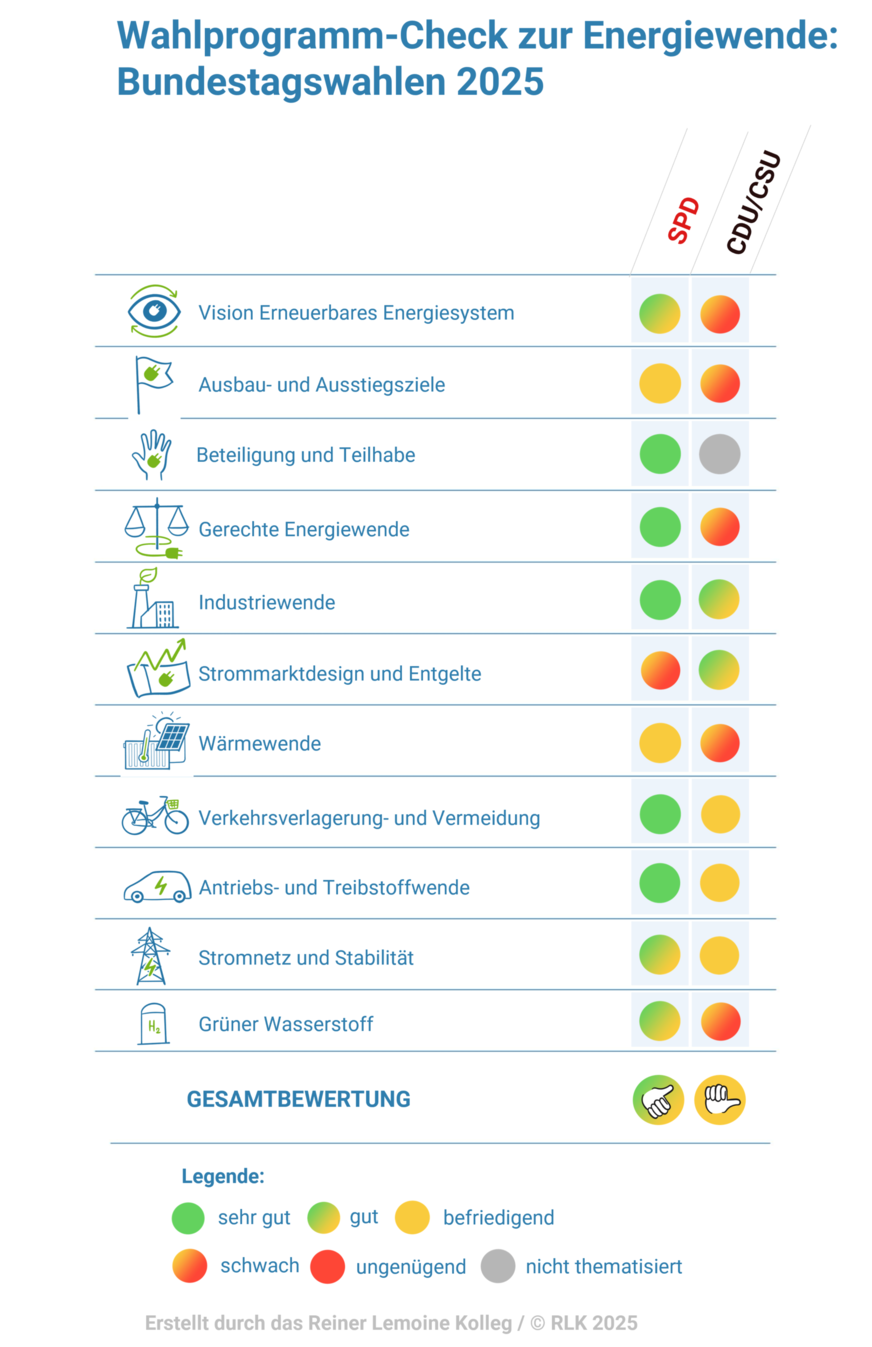 Mit der Bundestagswahl 2025 wird die Energiepolitik in Deutschland neu ausgerichtet. Wie im Wahlprogramm-Check des Reiner Lemoine Kollegs zu sehen, vertreten die Parteien im neuen Bundestag grundlegend verschiedene Ansätze in Bezug auf die Energiewende. Insbesondere die voraussichtlichen Koalitionspartner Union und SPD werden hier zentrale Themen für den Fortschritt der Energiewende entscheidend prägen. Grundsätzlich bekennen sich sowohl Union als auch SPD weiter zum Ziel der Klimaneutralität 2045.