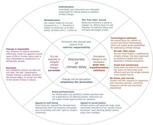Das Plädoyer dafür, nicht oder zumindest nicht adäquat auf die Klimakrise zu reagieren, stützt sich der Studie zufolge meist auf eine oder mehrere von insgesamt zwölf Argumentationsmustern, die sich von vier Kernaussagen leiten lassen.