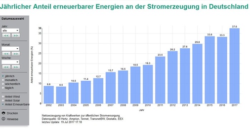 Allerdings gibt es reichlich Anhaltspunkte dafür, dass sich die Grünfärbung des Stroms aus der Steckdose deutlich vertieft hat. Laut dem Fraunhofer-Institut ISE in Freiburg, dass auf mit leicht anderen Methoden ebenfalls die Daten der Einspeisung aus verschiedenen Energiequellen in Deutschland ermittelt, hat sich der Anteil des Grünstroms auf sogar 37,6 Prozent erhöht. Dieser Anteil an der Nettoerzeugung aus Kraftwerken zur öffentlichen Stromversorgung in Deutschland hatte laut Fraunhofer-ISE-Daten 2016 noch 33,3 Prozent betragen. Im vergangenen Jahr allerdings trübte insbesondere ein unterdurchschnittliches Windaufkommen das Ergebnis. Schon 2015, als Wind und auch Sonne bessere Bedingungen für Erneuerbaren-Strom boten, erreichte die Einspeisung 33.6 Prozent, nachdem sie 2014 noch ganz knapp unter 30 Prozent betragen hatte.