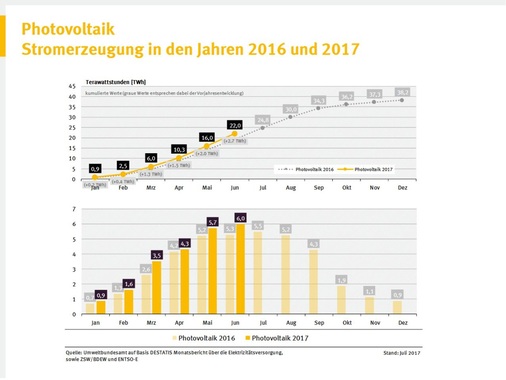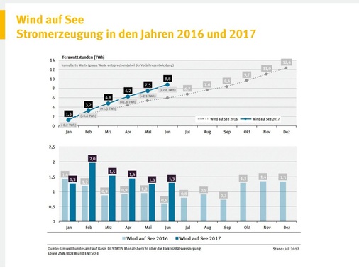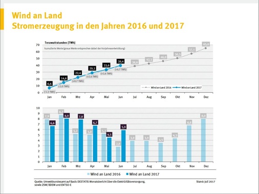 Laut AGEE-Stat speisten Windenergie-, Photovoltaik-, Wasserkraft, Geothermie- und sowohl reine Energie-Biomasse als auch biogene Anteile des Abfalls verwertende Anlagen damit 9,2 TWh beziehungsweise fast zehn Prozent mehr ins Netz, als in den ersten sechs Monaten des Vorjahres 2016. Im Juni sei die bundesweite Grünstromeinspeisung sogar auf einen bisherigen einmaligen Monatsrekordwert von 19,5 TWh angewachsen. Bereits im März war gemäß den AGEE-Stat-Werten die Einspeisung von Strom aus regenerativen Energiequellen mit 19,3 TWh fast so stark.