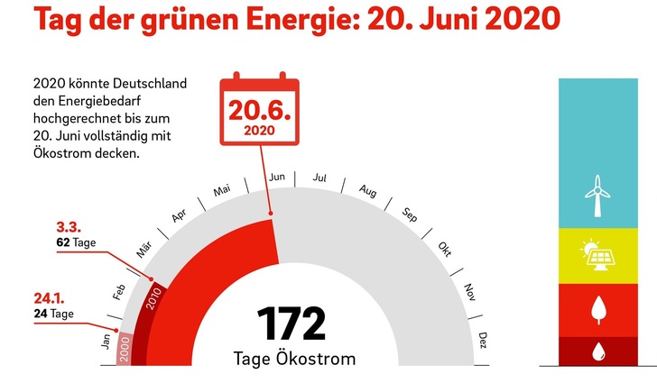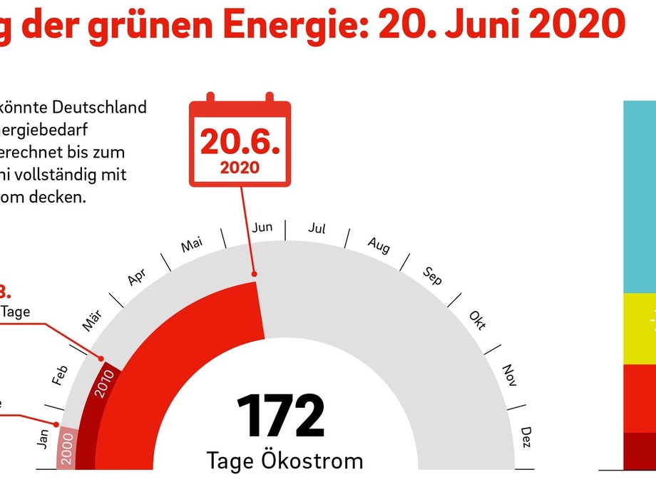 Eon betonte, der 20. Juni 2020 sei ein „Indikator für den Status Quo der Energiewende“ beziehungsweise ein „Tag der grünen Energie“. Verantwortlich für die erneute starke Zunahme des Grünstromanteils in den Leitungen seien „unter anderem Rekordwerte vor allem bei der Solar- und Windstromproduktion, hinzu kommt ein teils geringerer Strombedarf insbesondere im Frühjahr“, erklärte Eon.