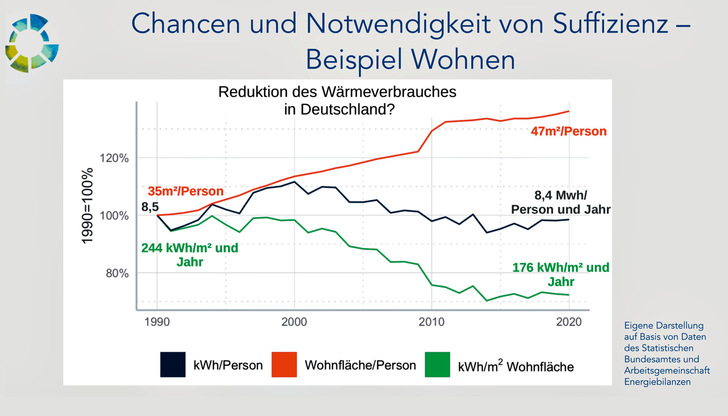 Zehn Jahre ist es her, da beschloss die Staatengemeinschaft in Paris das Ziel, die Erderwärmung auf möglichst 1,5 Grad zu begrenzen. Doch schon jetzt zeichnet sich ab, dass dies wohl unmöglich wird. Ein zentrales Problem: Fortschritte werden häufig durch höheren Verbrauch wieder zunichtegemacht. „Bislang setzt die Gesellschaft für das Erreichen der Klimaziele vor allem auf Effizienz und Konsistenz“, sagt Frauke Wiese, Juniorprofessorin für die Transformation der Energiesysteme an der Uni Flensburg. Also darauf, mit möglichst wenig eingesetzten Ressourcen einen möglichst hohen Ertrag zu erzielen und Technologien im Einklang mit der Natur zu nutzen. Effiziente Motoren oder die Nutzung erneuerbarer Energien zur Strom- und Wärmeerzeugung sind dafür Beispiele. Doch das allein reicht offenbar nicht. „Die Benefits dieser technischen Lösungen brauchen wir weitgehend durch Wachstum wieder auf“, erklärt Johannes Thema, Senior Researcher am Wuppertal Institut. So sei beispielsweise zwar der Wärmeverbrauch in Deutschland für Wohnraum zwischen 1990 und 2020 von 244 Kilowattstunden pro Jahr und Quadratmeter (kWh und Jahr) auf 176 kWh und Jahr gesunken. Weil aber zeitgleich die Wohnfläche pro Kopf von 35 m² auf 47 m² stieg, blieb eine Zahl praktisch unverändert: Pro Person werden rund 8,5 Megawattstunden pro Jahr verbraucht. In anderen Sektoren sieht das kaum anders aus: Dem Wachstum der erneuerbaren Energien steht ein stetig steigender Strombedarf gegenüber. Die Zahl der Elektroautos nimmt zwar zu, doch die Fahrzeugflotte insgesamt wächst noch schneller.