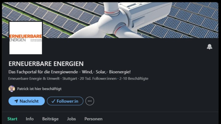 Auf unserer Unternehmensseite bei LinkedIn erfahren Sie täglich von den neues Entwicklungen der Energiewende. Zusätzlich erfahren als erstes von neuen Webinaren, Experteninterview und Angeboten von ERNEUERBARE ENERGIEN.