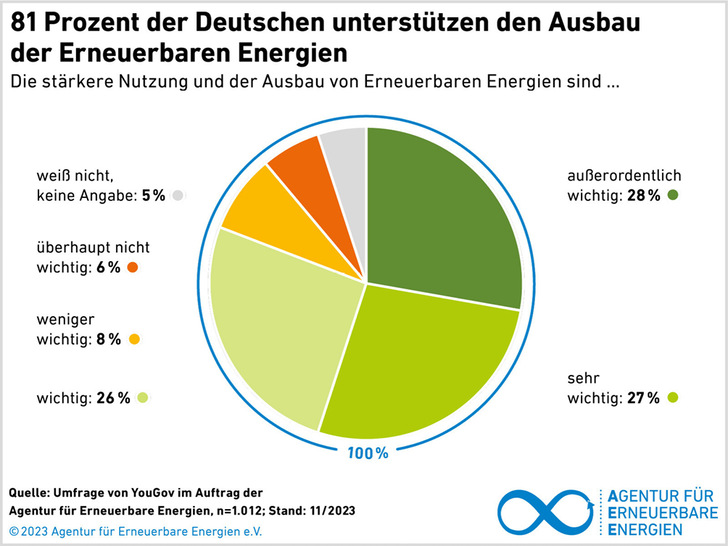 Die Akzeptanz für die Energiewende ist in Deutschland noch immer hoch, doch nach dem Ausnahmejahr 2022 geht die Zustimmung leicht zurück: 81 Prozent der deutschen Bevölkerung finden den Ausbau der erneuerbaren Energie wichtig, sehr wichtig oder besonders wichtig. 2022 waren es noch 86 Prozent, 2021 – vor dem Angriff Russlands auf die Ukraine – 83 Prozent. Das ergab die aktuelle, repräsentative Akzeptanzumfrage 2023 der Agentur für Erneuerbare Energien (AEE).