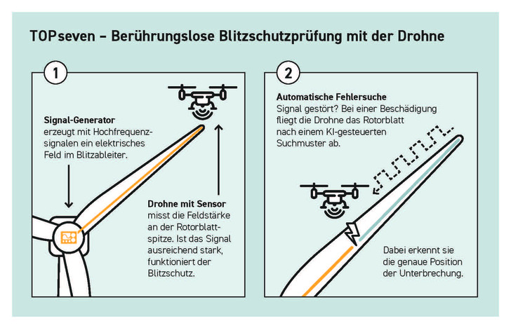Die Kernidee des innovativen TOPseven-Verfahrens besteht in der nicht-invasiven Einspeisung eines elektromagnetischen Feldes in die Blitzschutzanlage sowie in dem berührungslosen Abflug der Rotorblätter mittels einer Drohne. Diese ist mit einem speziellen Sensor zur Feldmessung ausgestattet. Die so erfolgte Messung kann mit Hilfe einer speziellen Messtechnik sowie mathematisch-algorithmischer Verarbeitung die Funktionsfähigkeit einer Blitzschutzanlage schneller, effizienter und genauer feststellen.