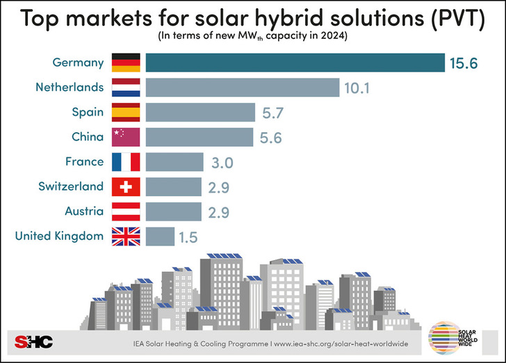 Angetrieben durch das Marktwachstum bei Wärmepumpen stieg die Nachfrage nach photovoltaisch-thermischen PVT-Kollektoren, auch bekannt als Hybridkollektoren, im Jahr 2024 deutlich an. Diese Systeme kombinieren ein PV-Modul mit einem darunter liegenden thermischen Absorber und ermöglichen die gleichzeitige Erzeugung von Strom und Wärme. Die Autoren beobachten eine wachsende Zahl von Markteinsteigern. Allein im Jahr 2024 gab es eine Rekordzahl von 46 Herstellern, die Verkäufe tätigen konnten. Insgesamt wurden 37,5 MW an thermischer und 18,6 MW an elektrischer Leistung installiert. (NW)