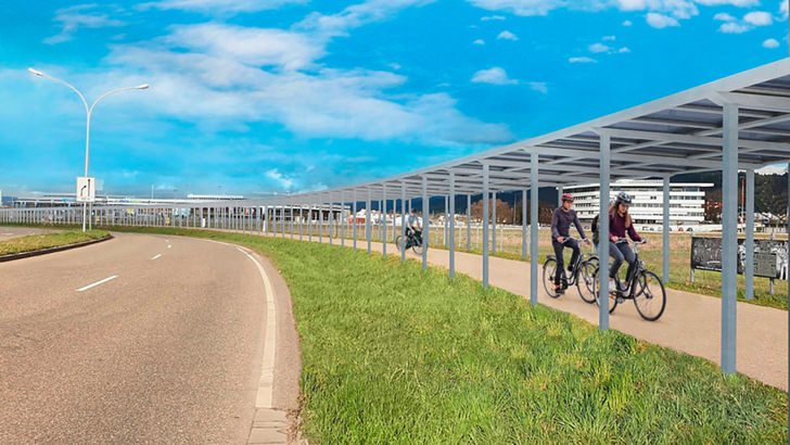 Mobilität ganz anders gedacht: Badenova plant, eine 300 Meter lange Überdachung, die Radfahrer am beliebten Radweg an der Freiburger Messe und in der Nähe des Fußballstadions vor Wind und Wetter schützt, mit Solarmodulen auszustatten. Ein solches Projekt sei in Deutschland bisher einzigartig, betont der Freiburger Ökoenergieversorger.