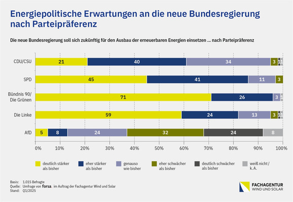 Eine große Mehrheit der Befragten erwartet unabhängig von der neuen Bundesregierung mehr Engagement für den Ausbau der Erneuerbaren Energien – auch 61 Prozent der CDU/CSU-Anhänger.
