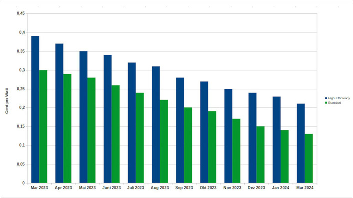 Seit Jahresanfang sind die Kosten für Solarmodule stetig gesunken. Zwischen 13 und 15 Prozent weniger müssen Projektierer für die Paneele im Durchschnitt bezahlen.