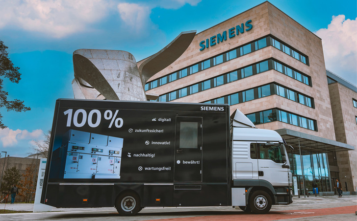 Im Siemens-Truck, auf dem Firmengelände von Siemens in Siemensstadt. Wie der Fokus sich an diesem Punkt in Berlin auf den Technologiekonzern verengt, so konzentriert sich auch der Informationsgehalt im Innenraum des „Electrification & Automation Showtrucks“. Hier werden Technologien vorgestellt wie die F-Gas-freie Mittelspannungsschaltanlage Blue GIS, ein digitales Umspannwerk, integrierte Strom- und Spannungsmessung direkt in der Durchführung und vieles mehr.Die Energieautomatisierung zur Integration der erneuerbaren Energien (EZA-Regelung) wollen wir uns genauer ansehen.