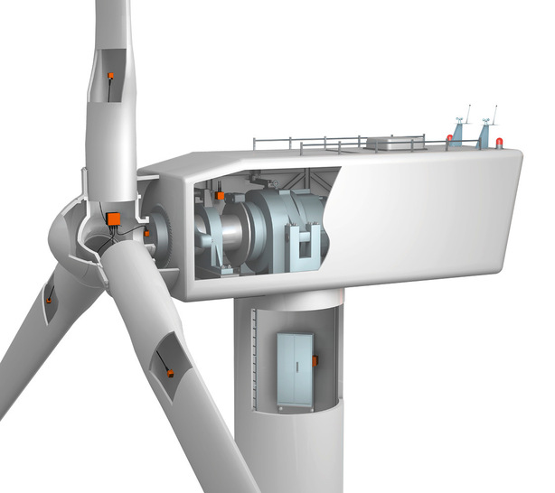 Aktuell gibt es eine Sensorposition pro Rotorblatt für zweidimensionale Beschleunigungsmessung und Temperaturmessung und einen Sensor für eindimensionale Beschleunigungsmessung in der Nabe. Insgesamt gibt es vier Positionen und zehn Messpunkte. Künftig soll es zwei Sensorpositionen pro Rotorblatt geben, dreidimensionale Beschleunigungsmessung, dreidimensionales Gyroskop, akustischer und Temperatursensor. Insgesamt sind es dann sechs Positionen und 48 Messpunkte.