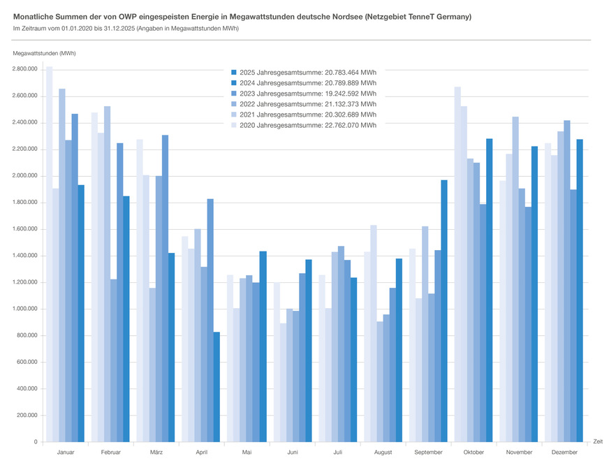 Obwohl im vergangenen Jahr 518 Megawatt (MW) neue Offshore-Windleistung in der Nordsee ans Netz angeschlossen wurden, liegt das Jahresergebnis 2025 in der Nordsee laut Tennet knapp unter dem Vorjahreswert. Angesichts eines schwachen Windjahrs und weniger Einspeisung der Parks an Land (106,5 TWh) stieg aber der Anteil des Nordsee-Stroms am deutschlandweiten Gesamtwindertrag auf 15,7 Prozent (Vorjahr 13,86 Prozent). Das Wind-Gesamtergebnis in Deutschland sank laut Tennet im Jahr 2025 auf 132,6 TWh, im Vorjahr betrug es 138,3 TWh.