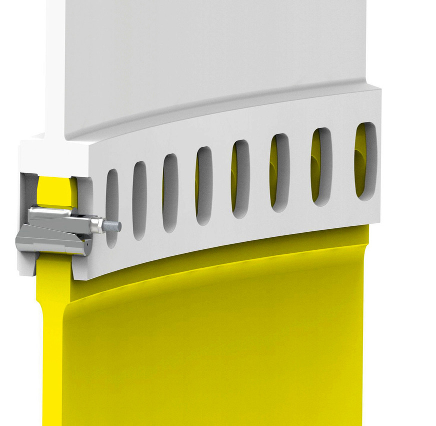 Die von Winkes geführten Entwickler ersetzen die Flanschverbindung durch eine neue Steckschnittstelle. Wo sich vorher die Flansche mit ihren Bohrungen für die Bolzen aneinanderfügen mussten wie eben ein aufrechtes und ein nach unten gespiegeltes L, steckt jetzt um im Bild zu bleiben ein angedicktes kleines l als Profil des unteren Turmsegments in einem nach unten zeigenden U-Profil des oberen Stahlzylinders. Das l-Profil ist durchgängig im gesamten Radius mit ovalen Öffnungen gespickt. Die Innenseite des U-Profils ist ebenso mit ovalen Öffnungen versehen, die deckungsgleich zu den Bohrungen des l-Profils sind. An der U-Innenseite angebrachte waagerechte Ladevorrichtungen tragen die innovativen Keile. Stecken die Turmsegmente ineinander, schieben Arbeiter die Keile ein und drehen mit dem Schrauber eine Mutter zu, die um eine aus dem Keil ragende Gewindestange steckt. Dies zieht die Gewindestange heraus, deren spezielle Geometrie im Innern des Keils die Spreizung auslöst.