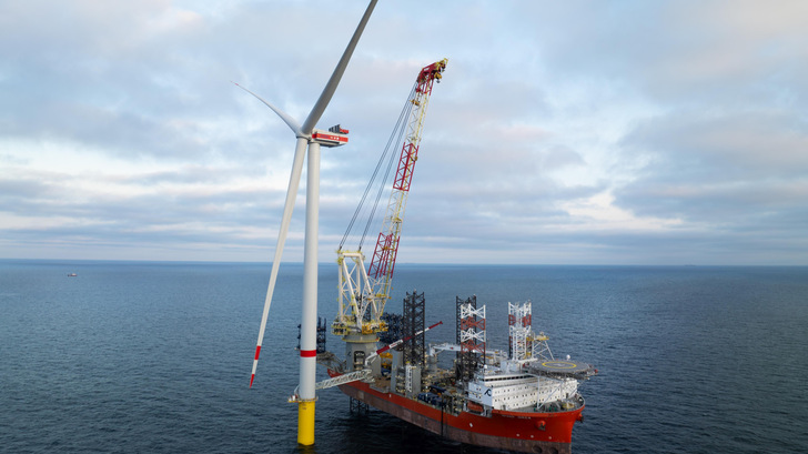 Es ist die erste von 64: Im Offshore-Windpark „He Dreiht“ dreht sich die erste Windenergieanlage. Laut Energiekonzern EnBW aus Baden-Württemberg ist der 960-MW-Windpark technisch eine Weltpremiere: Zum ersten Mal werde mit der Vestas V236-15.0 MW die größte am Markt erhältliche Windkraftanlage eingesetzt, heißt es in einer Presseinformation: Eine einzige Rotorumdrehung reiche aus, um rechnerisch vier Haushalte einen Tag mit Strom zu versorgen. Insgesamt rechnet EnBW mit einem Stromertrag, der jährlich 1,1 Millionen Haushalte versorgen kann und damit vergleichbar ist mit einem konventionellen Kraftwerk.