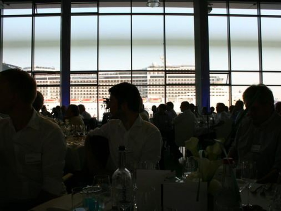 Da ist nicht nur der kinowürdige Breitband-Blick vom bestuhlten Hallensaal des Hamburg Cruise Centers auf die gigantischen vorbei ziehenden Kreuzfahrtschiffe. Dank der wie darauf abgestimmten Glasfrontgröße hat das Schauspiel in der Dämmerung während des Abendessens etwas von der Vollbilddarstellung eines herangezoomten Objekts auf der PC-Mattscheibe. Nicht wenige der Gäste an diesem Mittsommerabend im Juli dürften den Blick auf die Ozeanriesen als emotionalen Fingerzeig auf die schier unaufhaltsam wirkende geschäftliche Fahrt der Windkraftfirma Nordex wahrgenommen haben. Da ist aber auch die Sicht auf eine neue Nordex-Turbine N117 mit drei Megawatt (MW) Leistung. Der 2014 errichtete Prototyp liefert direkt Strom an das Hamburger Klärwerk Köhlbrandhöft, dessen zehn futuristisch anmutende Faultürme die Skyline der Südelbeseite gegenüber prägen.