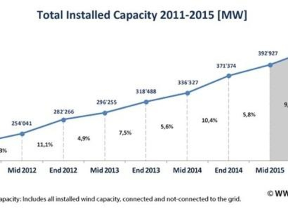 Die weltweite Windleistung hat Ende Juni 392.927 Megawatt (MW) erreicht, davon kamen 21.678 MW in den ersten sechs Monaten 2015 hinzu. Das Wachstum ist deutlich höher als 2014 und 2013, mit je 17,6 GW und 13,9 GW neu installierter Leistung. Die gesamte Windleistung weltweit Ende Juni 2015 war ausreichend, um vier Prozent des weltweiten Strombedarfs zu decken. Die globale Windleistung wuchs in sechs Monaten um 5,8 Prozent.