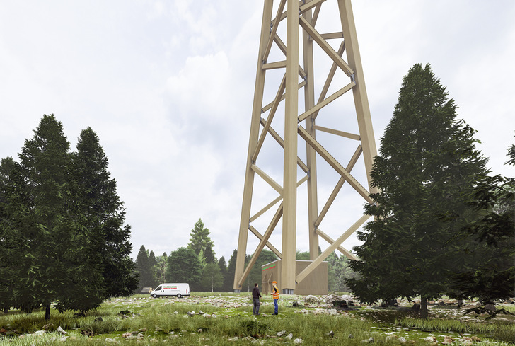 Um den Turm möglichst witterungsunabhängig errichten zu können, will Hasslacher auf der Baustelle nicht kleben, sondern schrauben: Die Verbindungen im Holzbau werden mittels eines bewährten Stahldübelsystems vorgefertigt. „Auf der Baustelle wird nur noch Metall mit Metall verschraubt, sodass wir zum Aufbau auch keine Spezialkräfte brauchen“, so Mussnig. Punkten will das Unternehmen auch mit dem Fundament: Der Turm benötige vier relativ kleine Einzelfundamente von insgesamt rund 360 Kubikmetern statt eines Flächenfundaments.