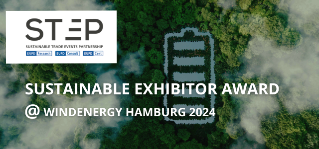 Die Sustainable Trade Events Partnership (STEP) Initiative lädt alle Aussteller der Wind Energy Hamburg 2024 herzlich zur Teilnahme am Sustainable Exhibitor Award ein. Mit dieser Auszeichnung sollen Unternehmen gewürdigt werden, die Anstrengungen unternehmen, um ihren Messestandbetrieb nachhaltiger zu gestalten. Willkommen sind sowohl Pioniere der Nachhaltigkeit als auch zukunftsorientierte Unternehmen, die zwar noch nicht an der Spitze stehen, aber die Bedeutung der Integration von Nachhaltigkeitsmaßnahmen in ihren Messeauftritt erkannt haben.