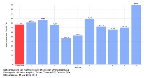 Anfang März purzelten die Rekorde: In der Woche vom 4. bis 10. März haben die erneuerbaren Energien mit 64,8 Prozent zur öffentlichen Nettostromversorgung in Deutschland beigetragen, ein neuer Rekordwert.