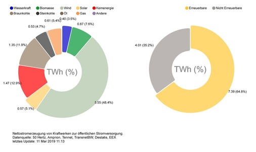 2018 hatten die erneuerbaren Energien mit 40,2 Prozent Anteil an der öffentlichen Nettostromerzeugung einen neuen Rekord aufgestellt, für das Jahr 2019 liegt der bisherige Durchschnitt mit 43,3 Prozent laut ISE noch darüber. Wind- und Solarenergie seien 2018 die wichtigsten erneuerbaren Energiequellen im Strommix mit einem Anteil von 20,4 bzw. 8,4 Prozent gewesen.