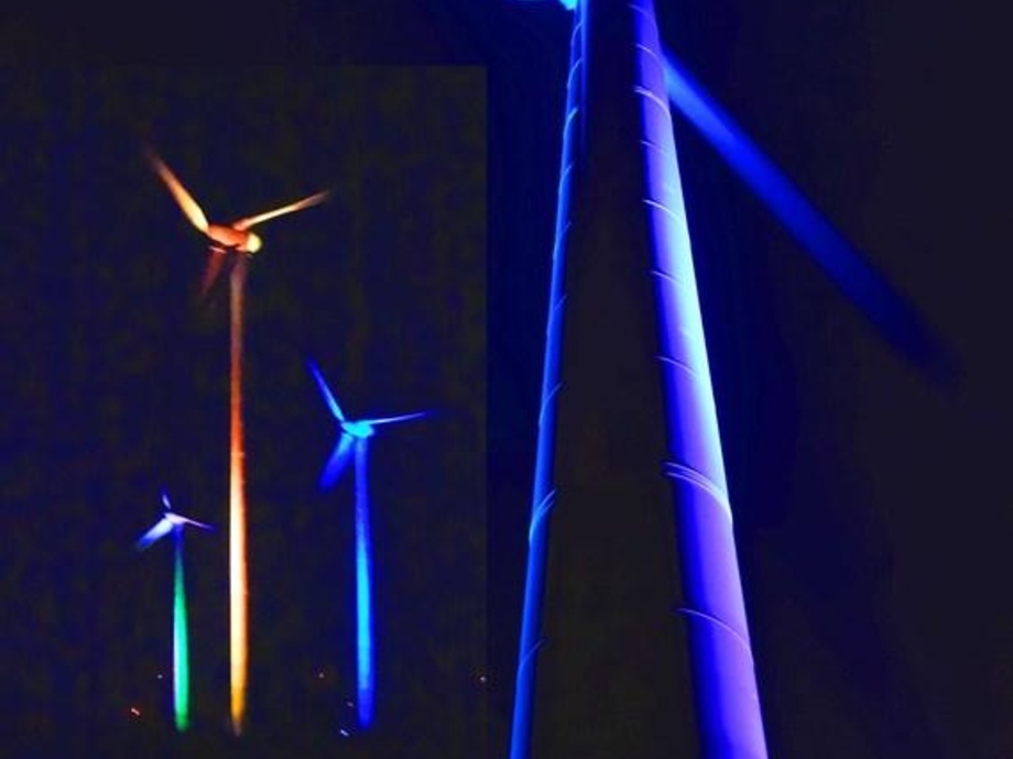 Was erwartet die Besucher im Windtestfeld während der Husum Wind? In verschiedenen Kompositionen für Licht und Farbe erscheinen dort mal alle Türme in derselben Farbe, die sich dann je Turm nuancenreich differenziert. In Erweiterung bringen die Farben und Tempi der Farbwechsel alle Türme zusammen. Um das zu ermöglichen sind alle 15 LED in Deutschland, die dafür geeignet sich, dort versammelt: Leistungsaufnahme von neun Leuchten ist ein Kilowatt, von sechs Leuchten drei Kilowatt. "Ich verwende als mein Lichtorchester hocheffiziente Spezialscheinwerfer mit sehr geringem Stromverbrauch. Sie schicken ihr Licht von unten am Turm entlang nach oben zu Gondel und Rotorblättern", so Meyer-Hahn. Mehr Infos hier.
